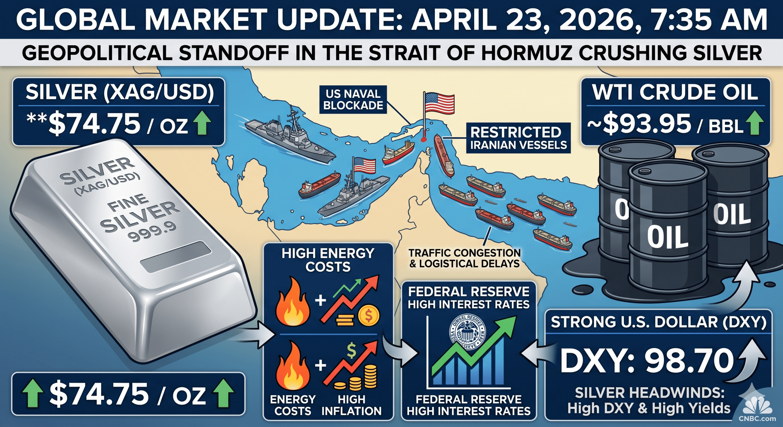 Silver’s current valuation of $74.75 per ounce is directly suppressed by the cascading effects of this naval blockade. The relationship functions through a clear data-driven economic chain: