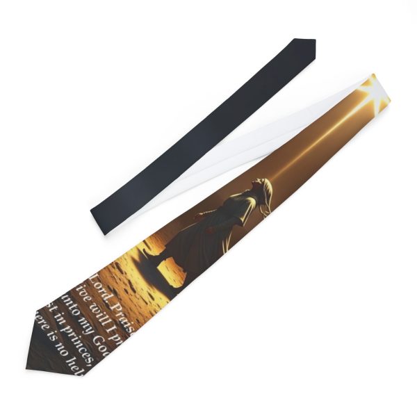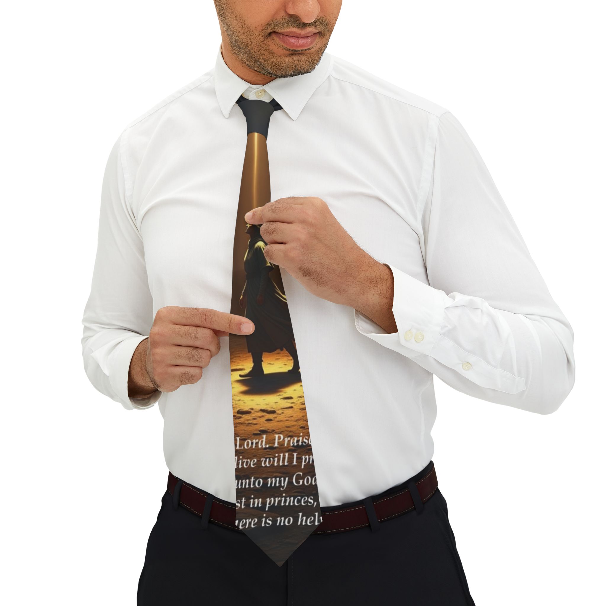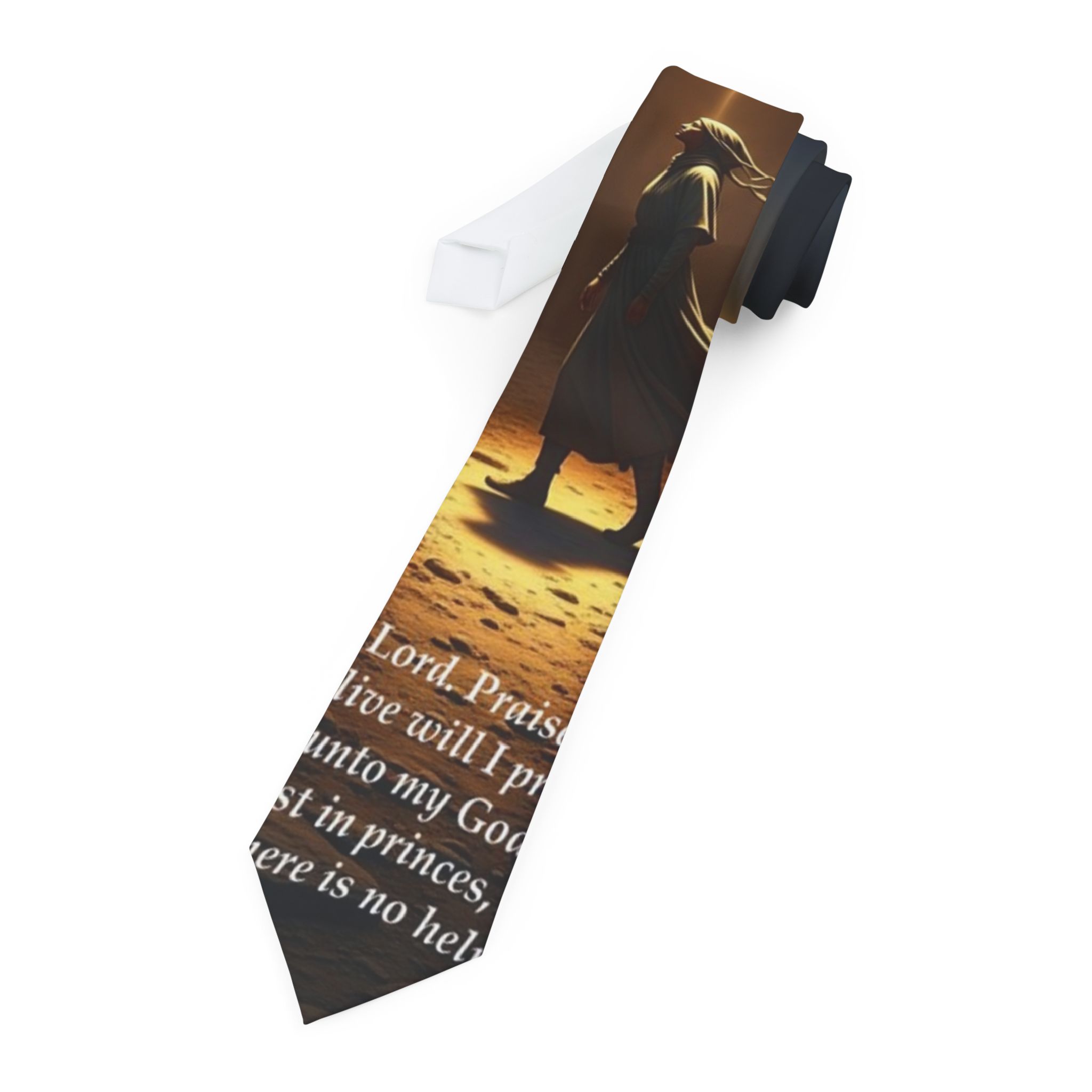 The Psalm Path Tie is a wearable declaration…an editorial blend of scripture and silhouette. Featuring a lone figure bathed in radiant light and anchored in the words of Psalm 146, this design captures the soul’s upward posture: praising while breath remains, trusting not in princes, but in the eternal.